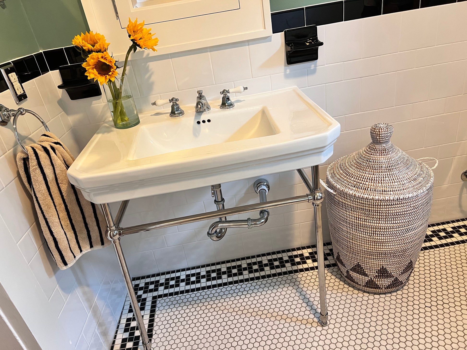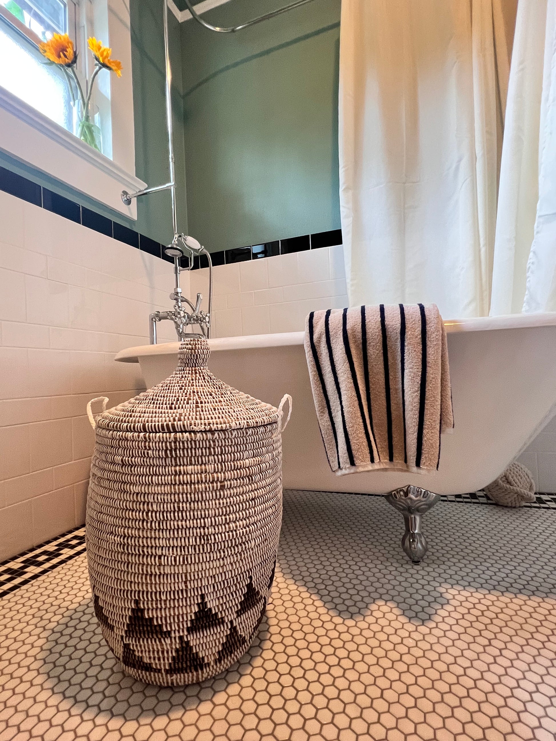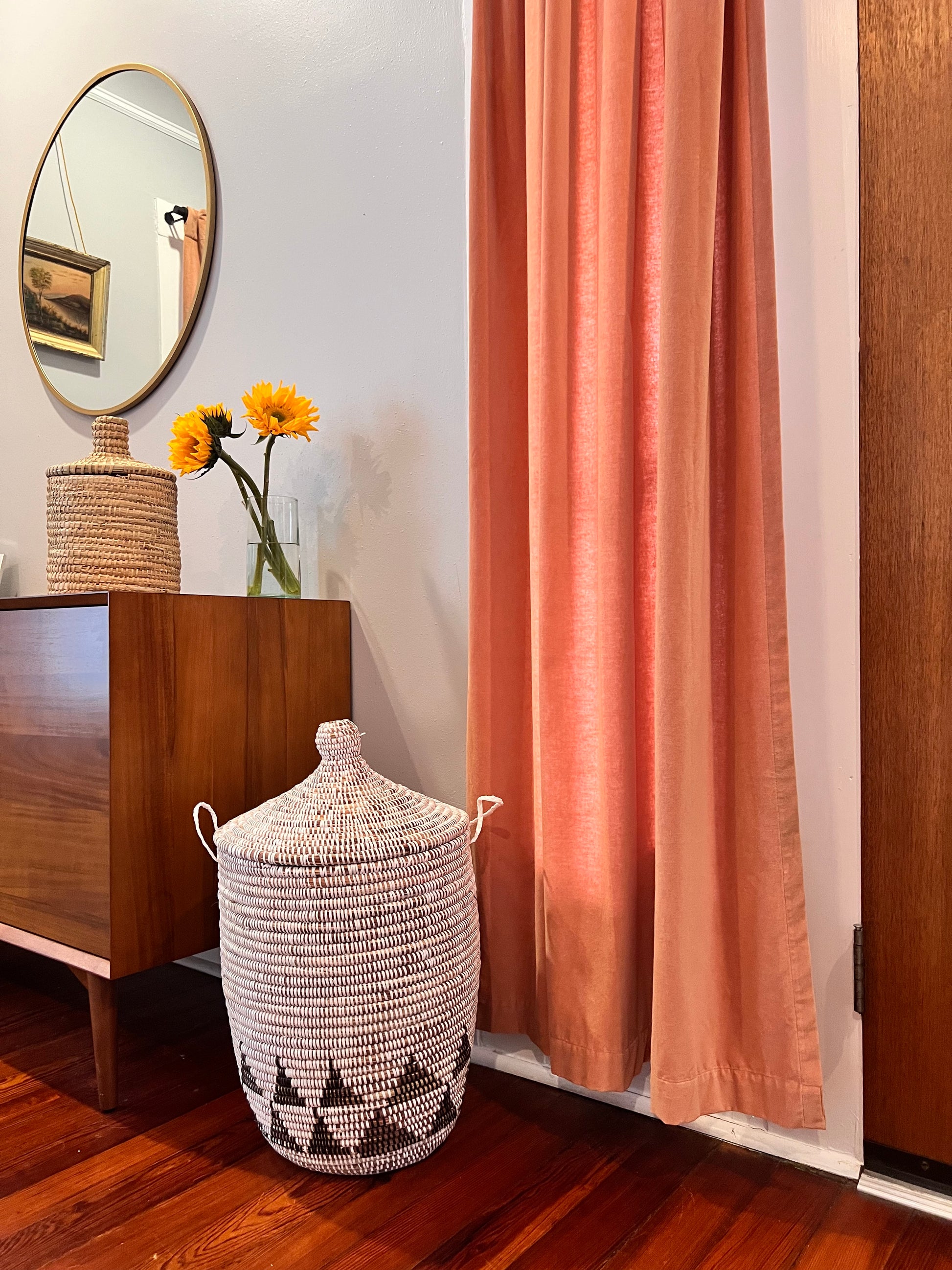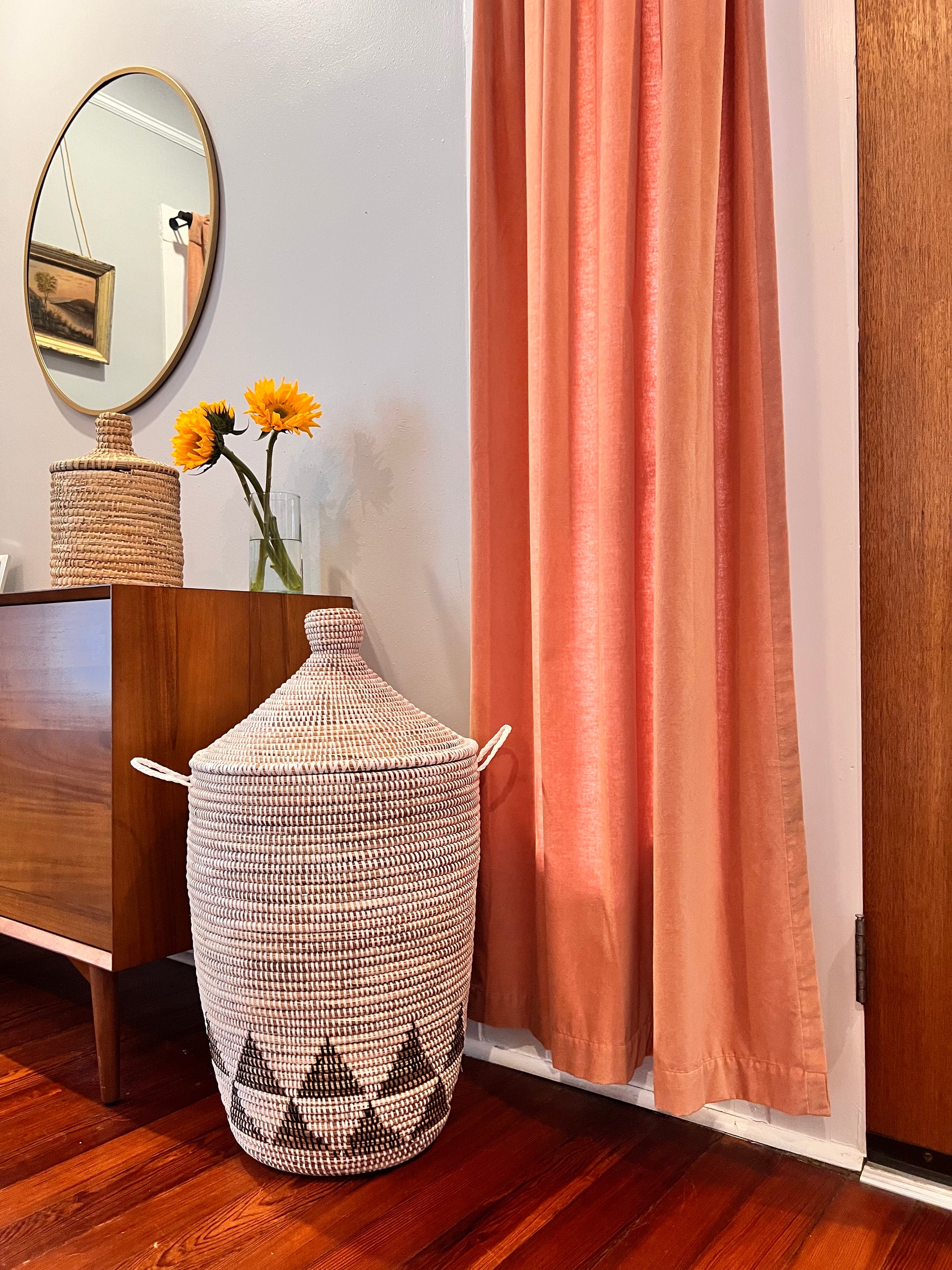 This basket can be used for laundry; storage for towels, toys, or anything you can think of! This basket is handmade in Senegal by local artisans and will never go out of style. These baskets are woven with straw and recycled plastic.